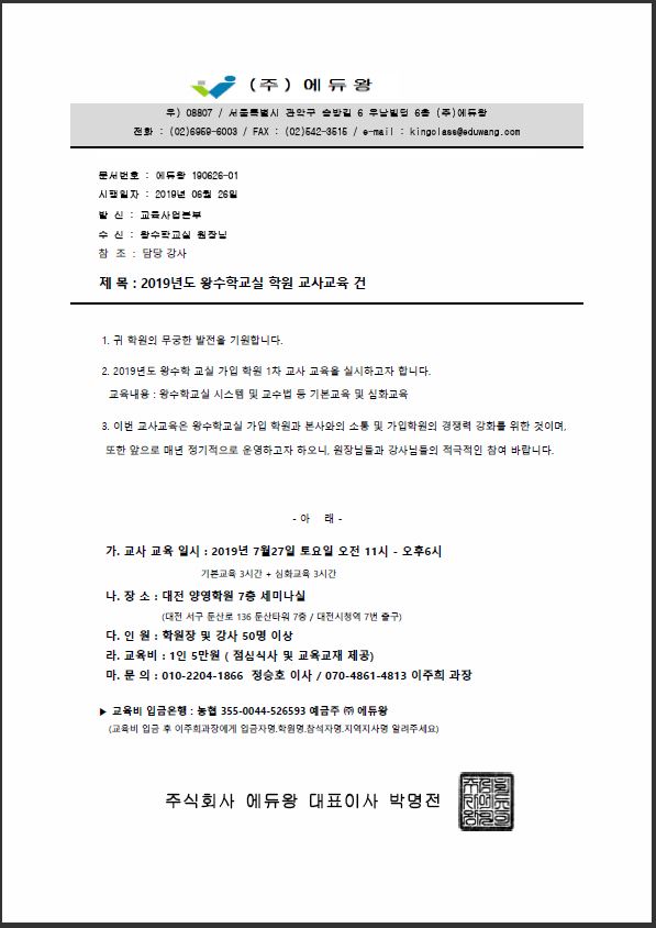 | 2019년도 왕수학교실학원 교사 교육 건 |